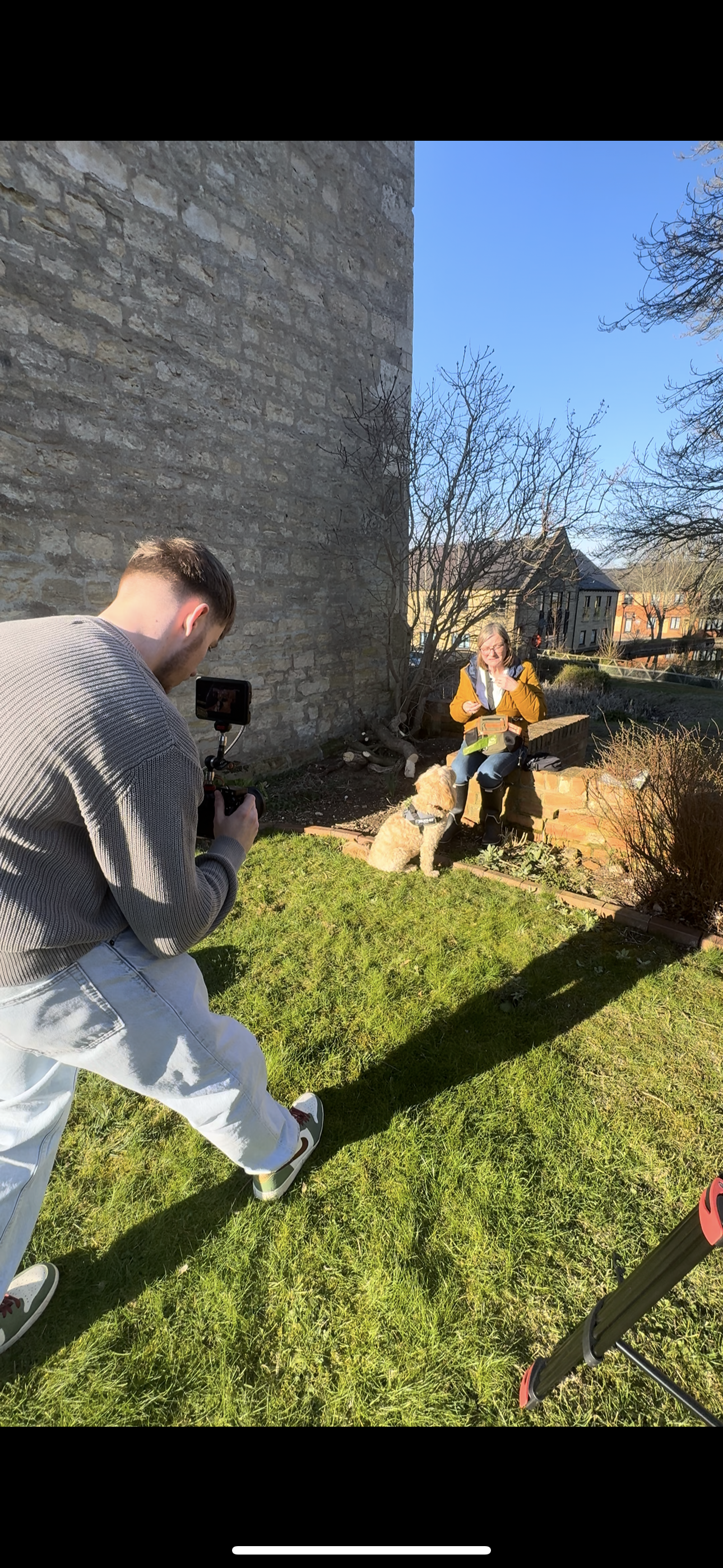 A person filming a woman sitting on a brick ledge with a dog on a leash nearby in an outdoor garden area, under a clear blue sky.